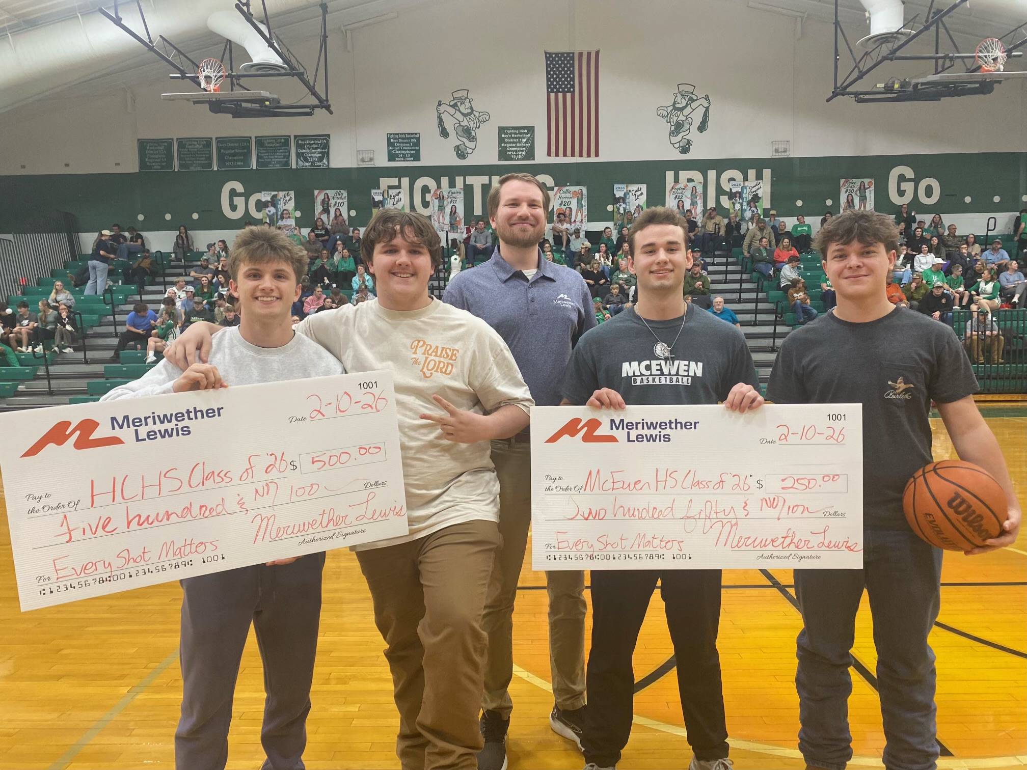(February 13, 2026 – Erin, TN) — Meriwether Lewis showed its support for local high school senior classes by hosting a basketball halftime relay called “Every Shot Matters.” The competition came to Houston County High School Tuesday night where Houston County Senior Preston Mitchell faced off against McEwen High School Senior Ben McPherson to see who could make a layup, free throw and 3-pointer first. Mitchell finished the relay first earning a $500 donation to the class of 2026. McEwen received $250 for participating in the event.
