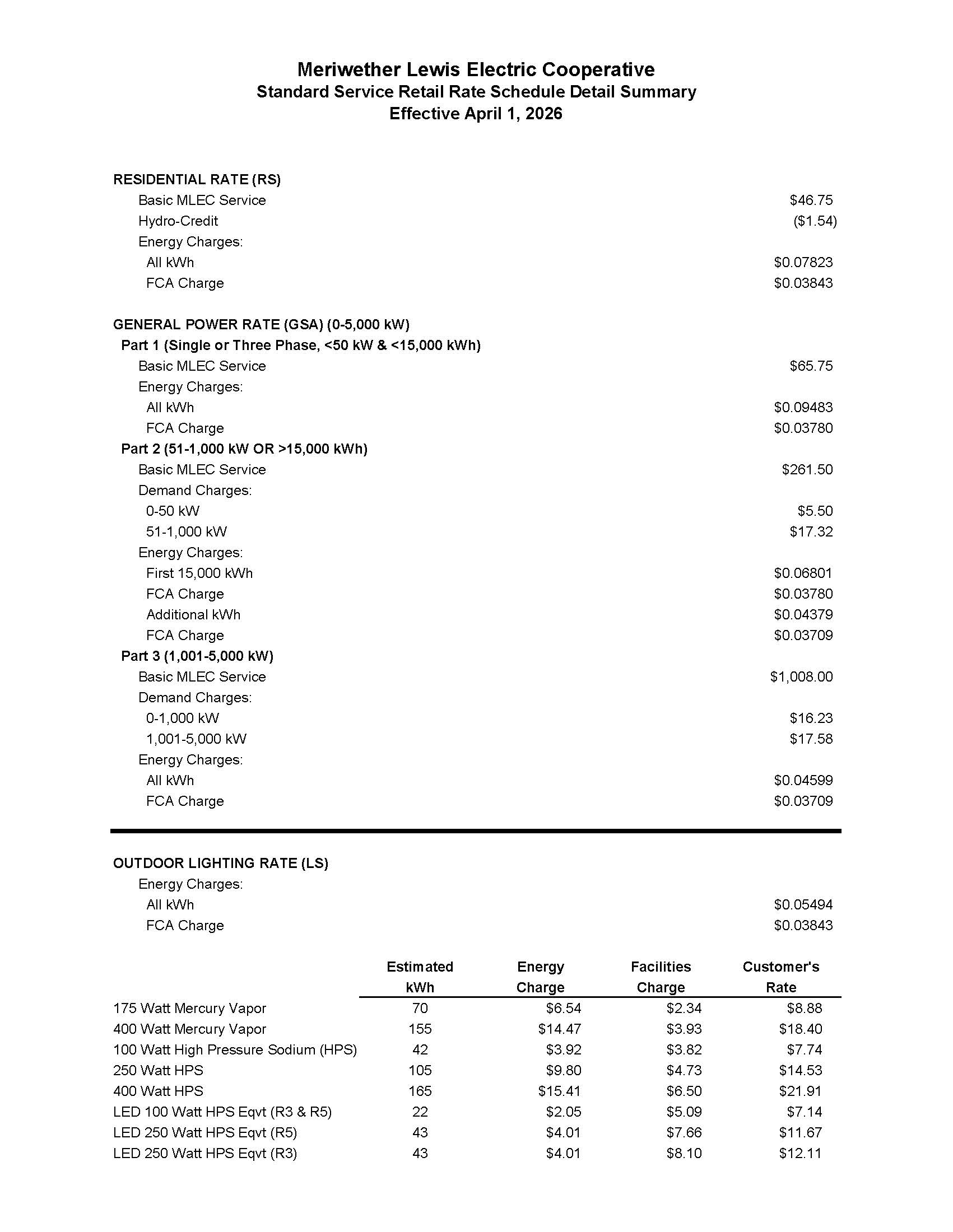 Rates are subject to a Fuel Cost Adjustment (FCA) from the Tennessee Valley Authority. This mechanism allows TVA to adjust rates up or down as fuel and purchased-power costs rise and fall. It affects the energy (per kilowatt-hour) charges for all customers. MLEC retains NONE of the revenue from the FCA; the entire amount goes to TVA.